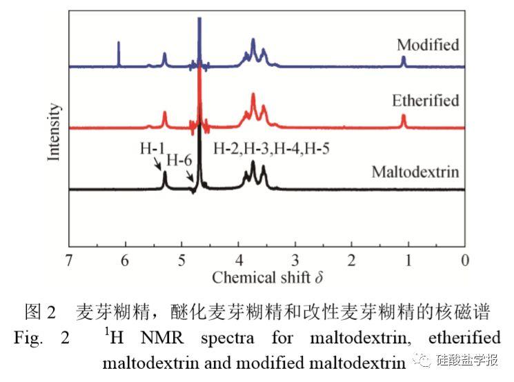 1) 以麦芽糊精为原料,经过醚化改性和羧基化改性后,合成了一种新型聚羧酸系减水剂。红外光谱和核磁谱均表明,合成产物结构中含有羟丙基基团和羧基基团。