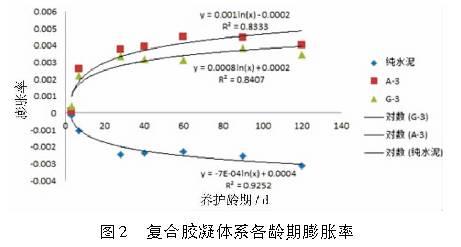 当在水泥基材料中掺入过量的脱硫石膏时,由于过多硫酸盐的引入可能导致硬化浆体膨胀开裂。笔者研究无水脱硫石膏和二水脱硫石膏的膨胀性能发现,当脱硫石膏掺量(脱硫石膏掺量为15%) 相同时,复合胶凝体系中掺无水石膏的体系各龄期膨胀率较大,且均大于掺二水脱硫石膏的复合体系。无论掺入二水脱硫石膏或是无水脱硫石膏,其个龄期膨胀率与对数函数y = A.ln(x)+B呈良好的关系,可见复合体系膨胀率最终将趋于稳定。