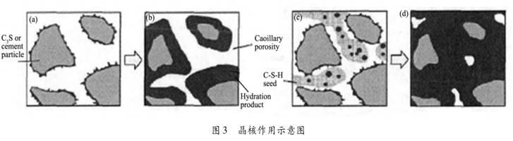 如图 3,由于纳米矿粉表面活性键较多,掺入到水泥基材料中可作为水化过程中“现成”的“晶种”,使水化过程不必存在一个“形成 C-S-H 稳定晶核”的过程,而直接在纳米矿粉微粒的表面继续生长,形成的C-S-H 相,把松散的 C-S-H 凝胶变成纳米矿粉微粒为核心的网状结构,形成整体、均匀、致密的二级界面的最佳状态;且纳米矿粉微粒粒径越小,水化成核点越多,纳米材料晶核作用就越显著。这类模型对晶核作用原理的解释较为科学,目前广为采用。